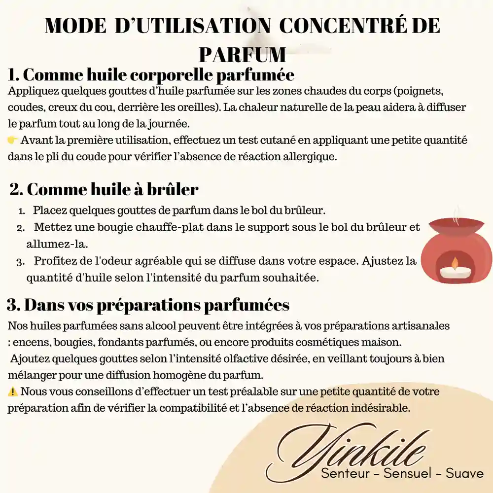 Comme huile corporelle parfumée : appliquée sur la peau, elle nourrit et parfume subtilement tout en laissant un sillage sensuel et raffiné.